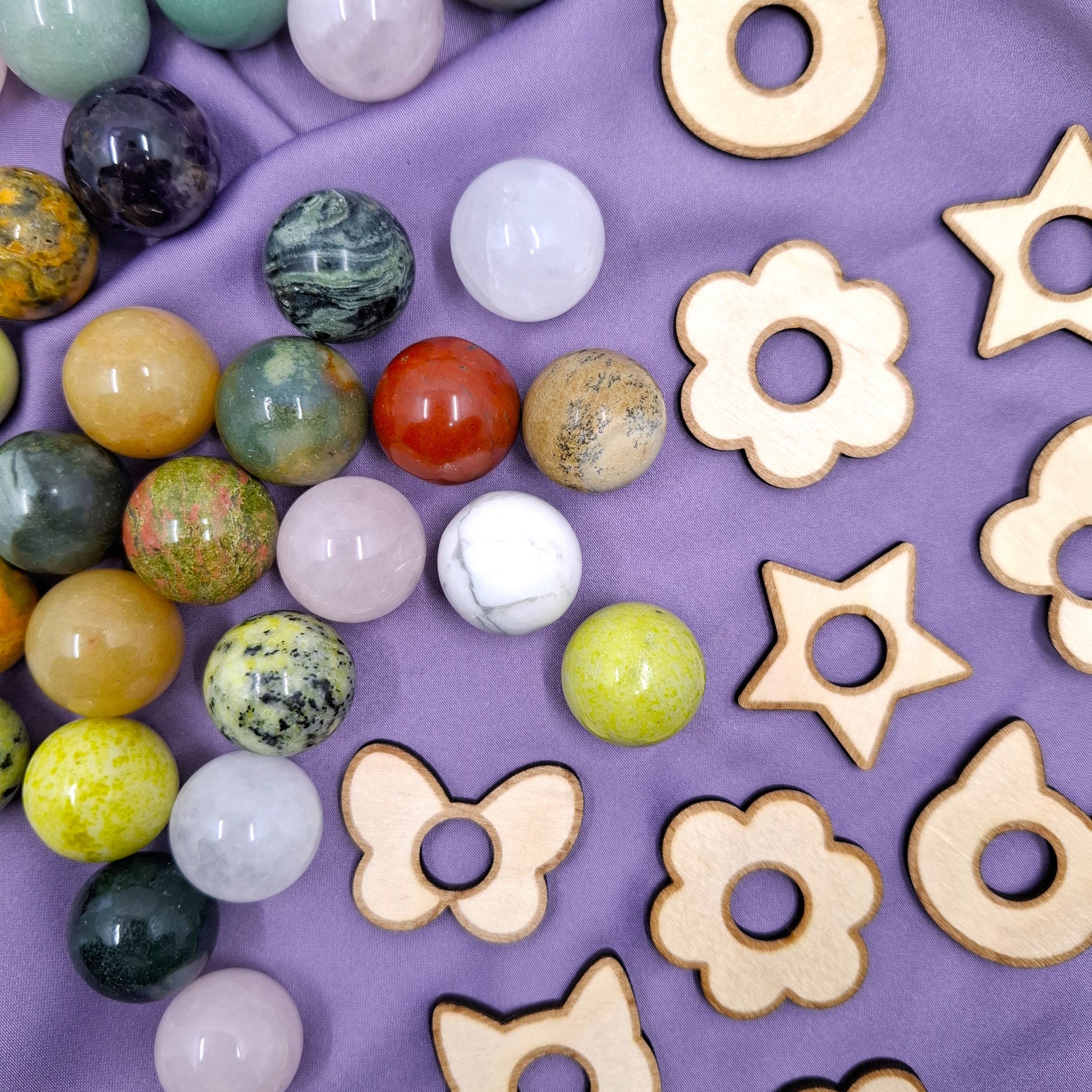 Sisältää 3 kpl Mysteerikivikuulia ja 3 kpl pieniä kivipalloalustoja. Saamasi kuulat ja alustat ovat satunnaisia. Tilauksessa kerrotaan, mitä materiaalia saamasi kuulat ovat.