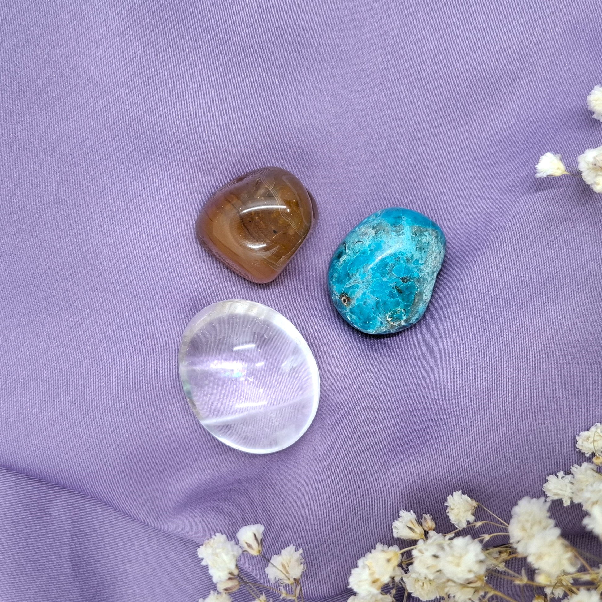 Sisältää 3 kpl kaksoset-horoskoopille sopivia kiviä: akaatti, krysokolla, vuorikristalli. Korostavat merkin hyviä ominaisuuksia ja tyynnyttävät heikkouksia.