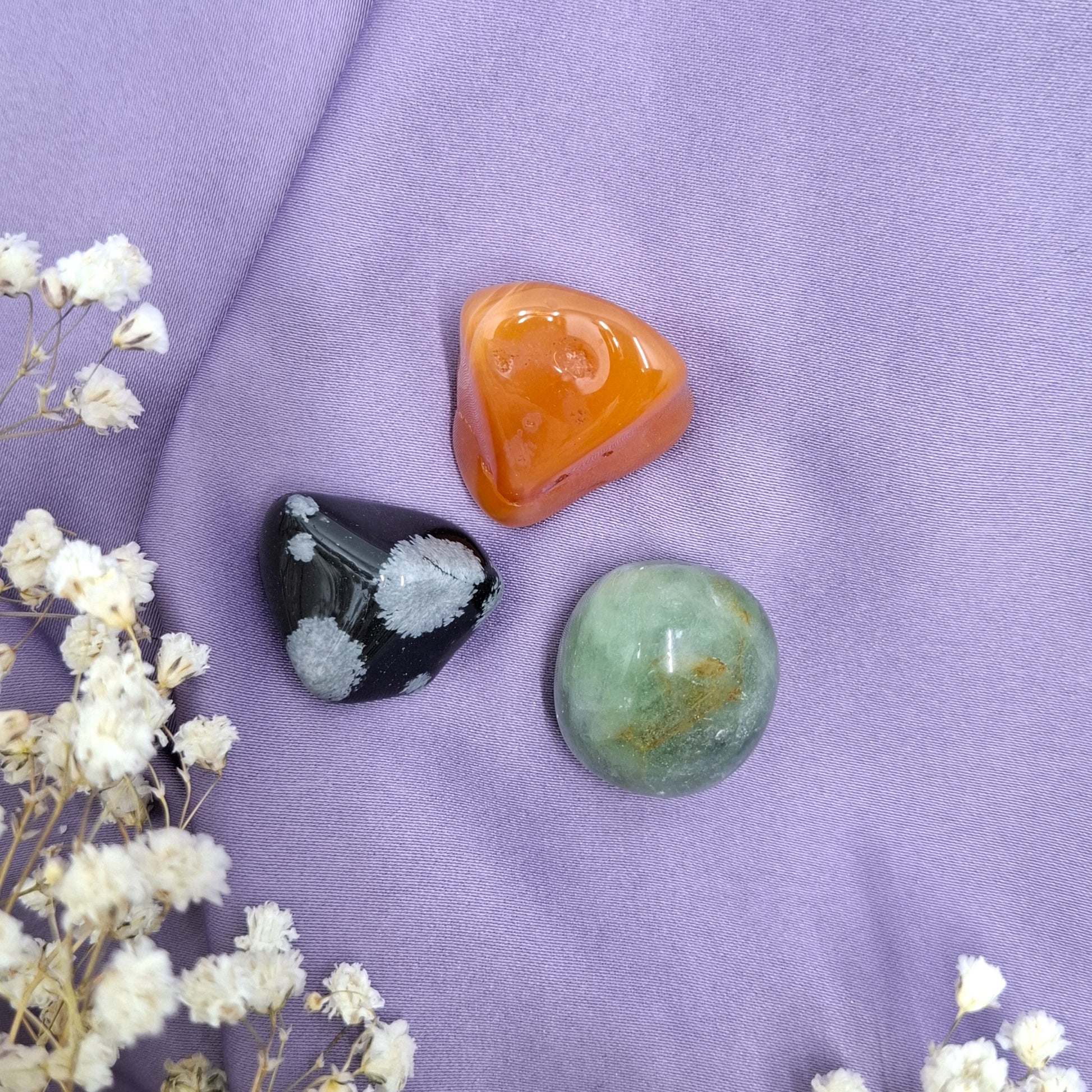 Sisältää 3 kpl kauris-horoskoopille sopivia kiviä: lumihiutaleobsidiaani, fluoriitti, karneoli. Korostavat merkin hyviä ominaisuuksia ja tyynnyttävät heikkouksia.