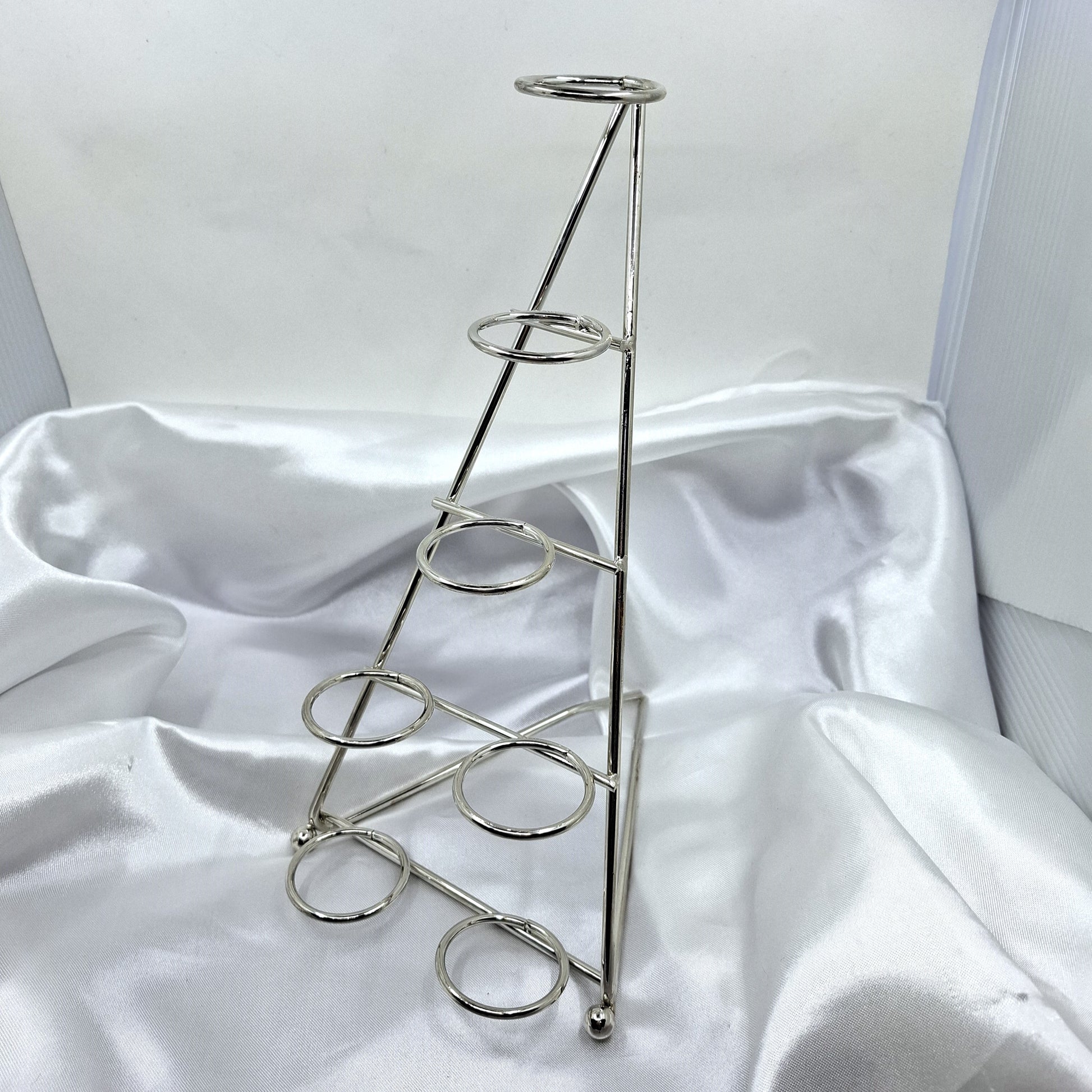 Hopean värinen teline seitsemälle kivipallolle. Telineen korkeus 26cm. Sopii parhaiten 35-45mm kivipalloille.